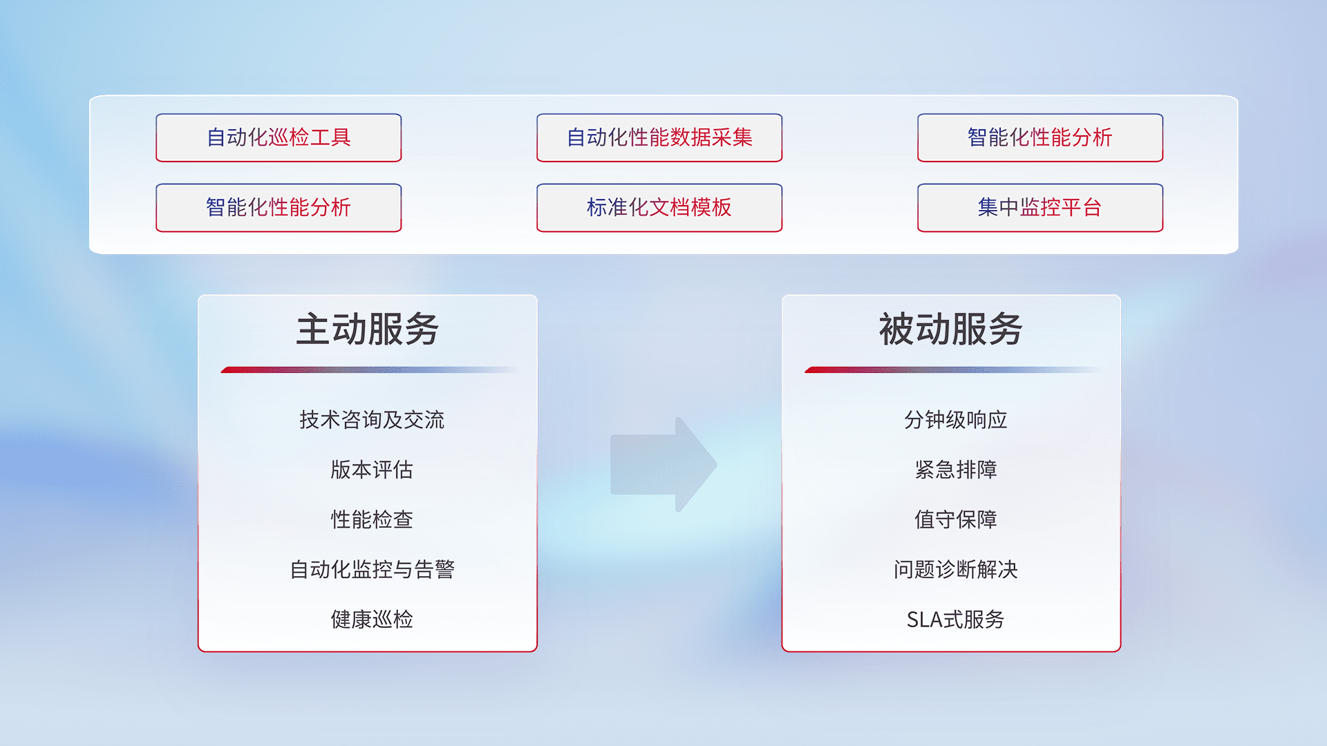 智能化工具和标准化文档,,保障服务质量,,提供主动服务(包含技术咨询、、版本评估、、性能检查、、自动化监控与告警、、、、健康巡检)和被动服务包含(分钟级响应、、、紧急排障、、、、值守保障、、、问题诊断解决、、、、SLA服务)。。